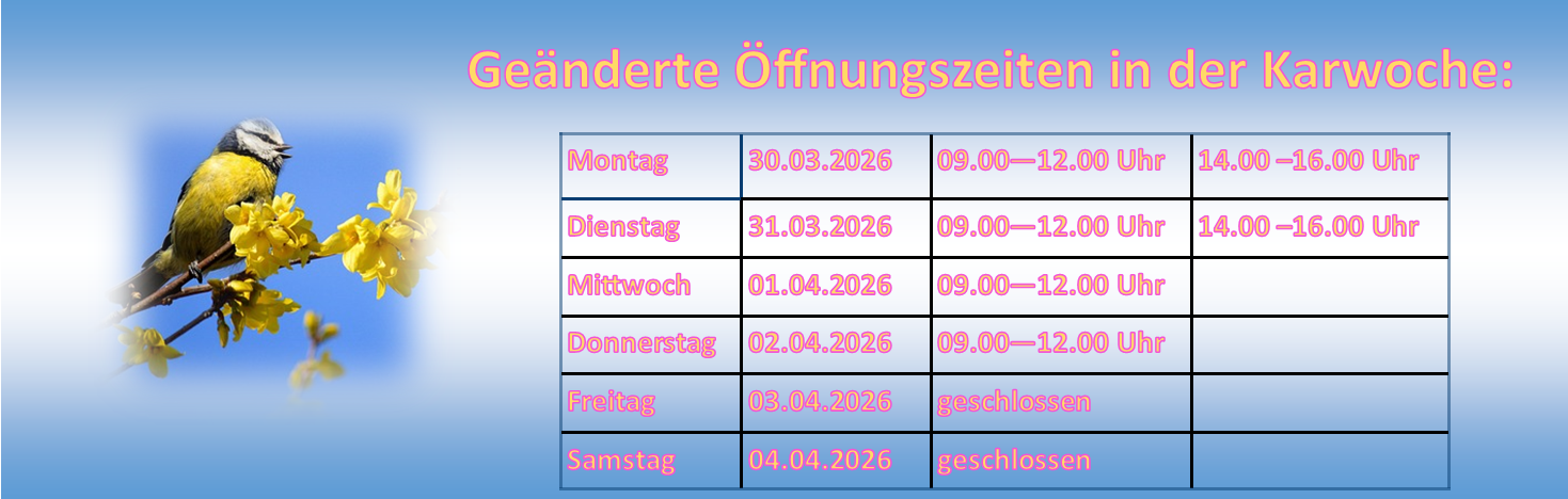 | Dienstag | 900 - 1200 | 1400-1600 |